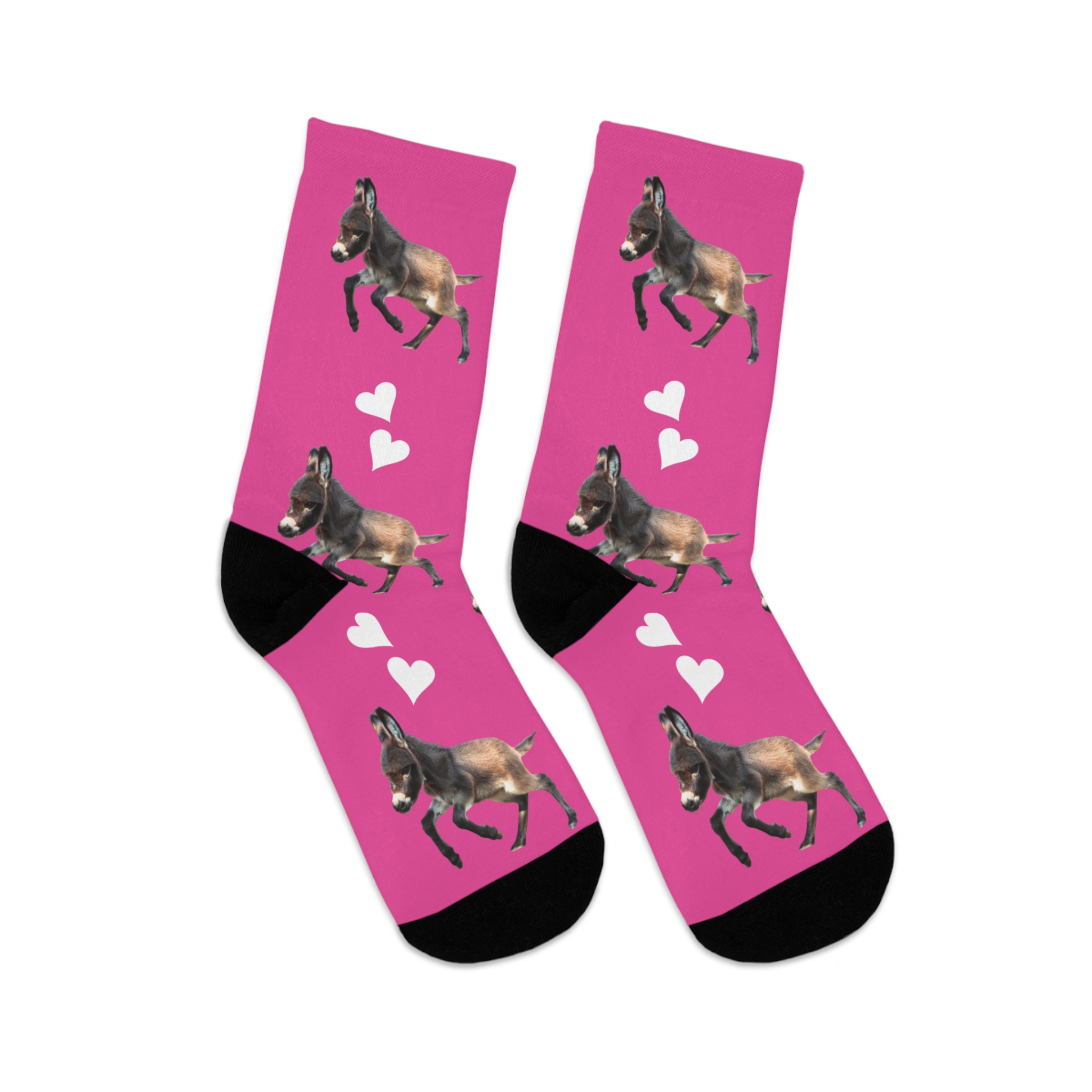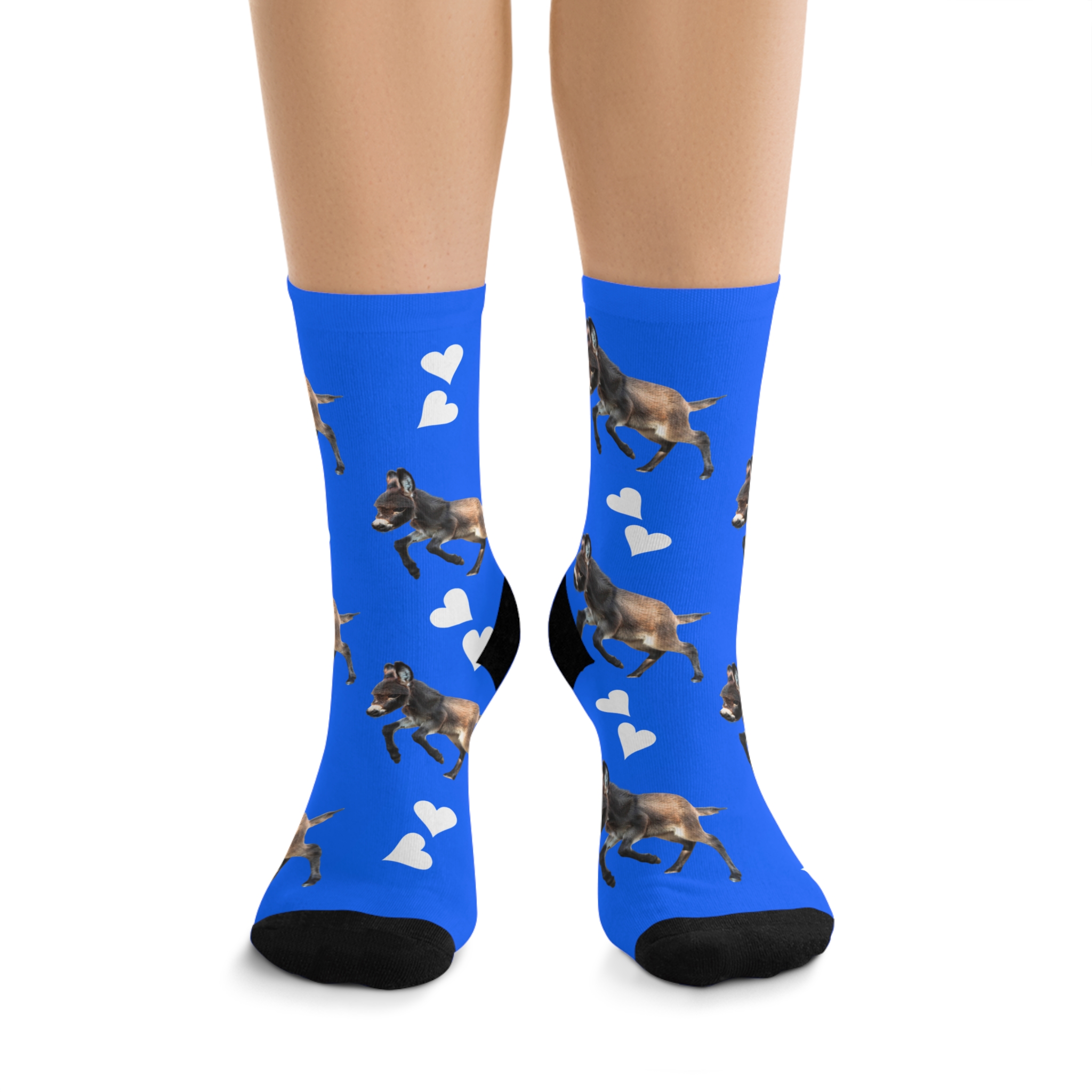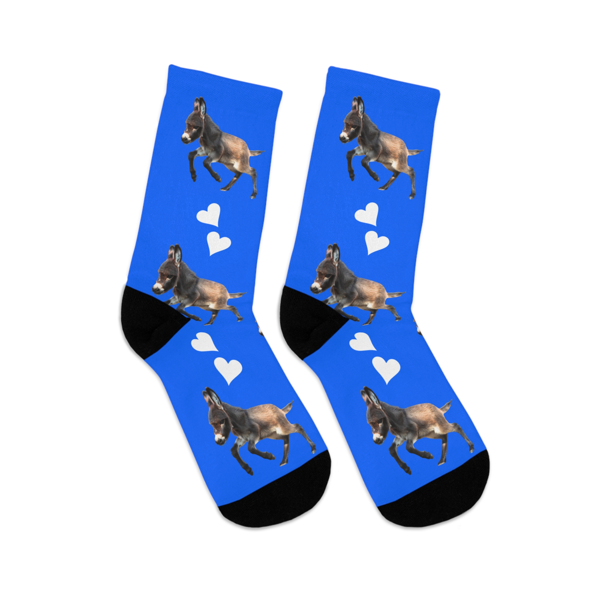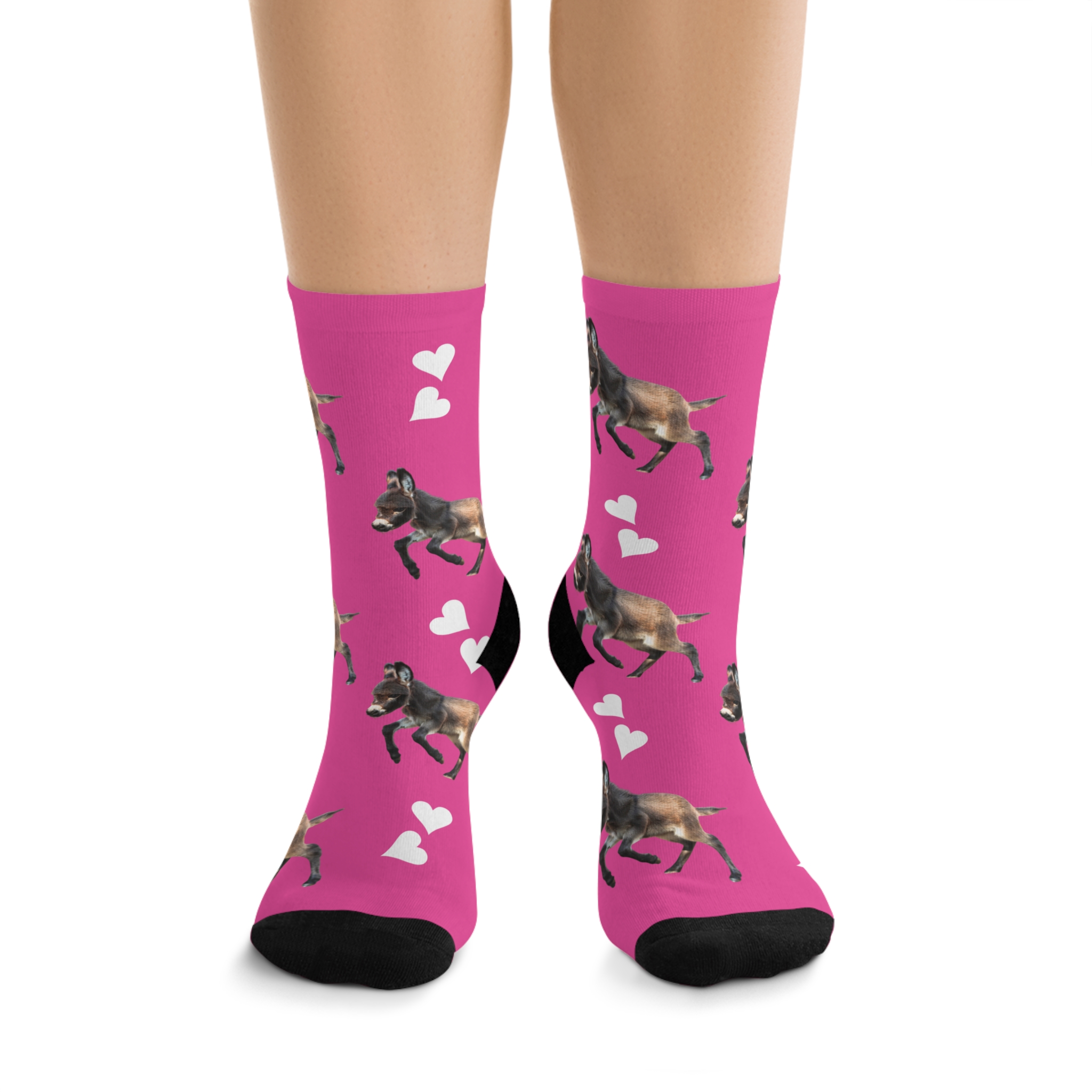 Näillä sukilla kelpaa askeltaa, sillä matkassa kulkee suloinen ja vauhdikas miniaasivarsa Calle. Sukissa kuviona myös valkoiset sydämet. Väreinä sukissa sininen tai vaaleanpunainen.